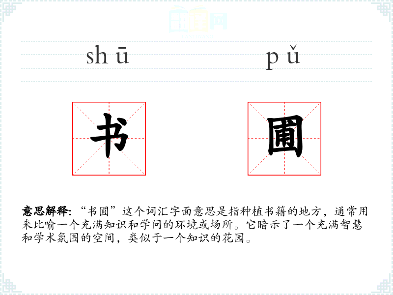 “书圃”这个词汇字面意思是指种植书籍的地方,通常用来比喻一个充满知识和学问的环境或场所。它暗示了一个充满智慧和学术氛围的空间,类似于一个知识的花园。