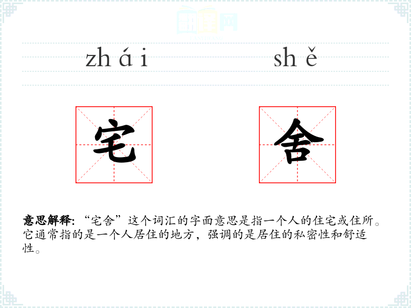 “宅舍”这个词汇的字面意思是指一个人的住宅或住所。它通常指的是一个人居住的地方,强调的是居住的私密性和舒适性。