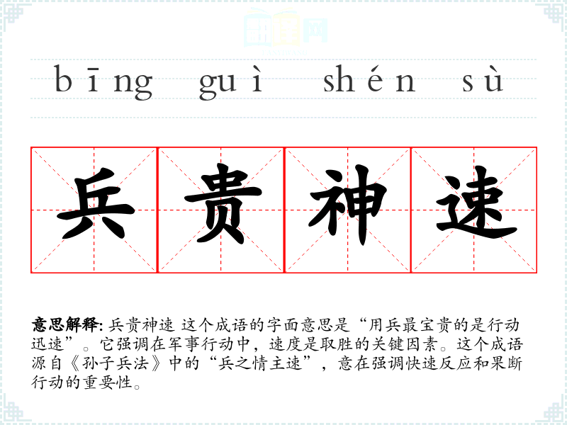 兵贵神速 这个成语的字面意思是“用兵最宝贵的是行动迅速”。它强调在军事行动中,速度是取胜的关键因素。这个成语源自《孙子兵法》中的“兵之情主速”,意在强调快速反应和果断行动的重要性。