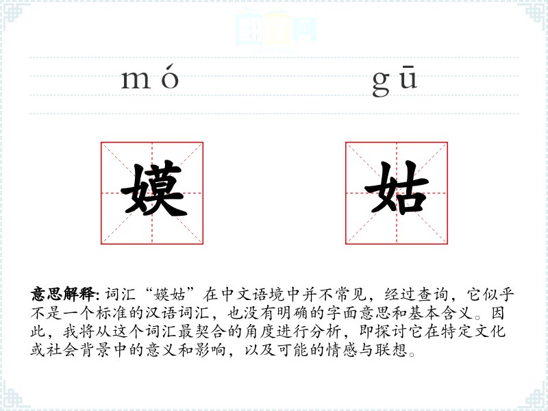 由于“嫫姑”不是一个标准词汇,我们无法对其进行深入的分析和理解。在语言学习和表达中,了解和掌握标准词汇是非常重要的,这有助于我们更好地沟通和理解文化。对于不常见的词汇,我们应该谨慎使用,并在必要时寻求更多的信息和解释。
