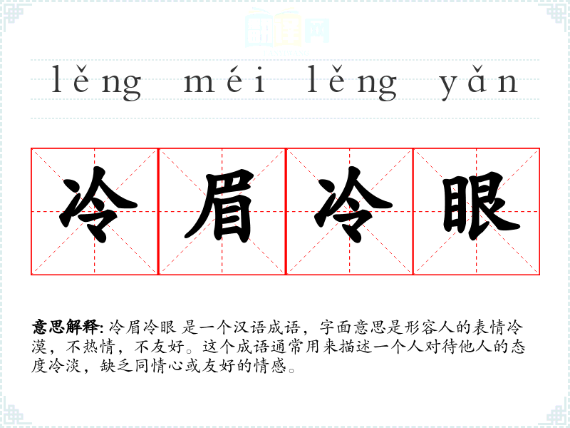 冷眉冷眼 是一个汉语成语,字面意思是形容人的表情冷漠,不热情,不友好。这个成语通常用来描述一个人对待他人的态度冷淡,缺乏同情心或友好的情感。