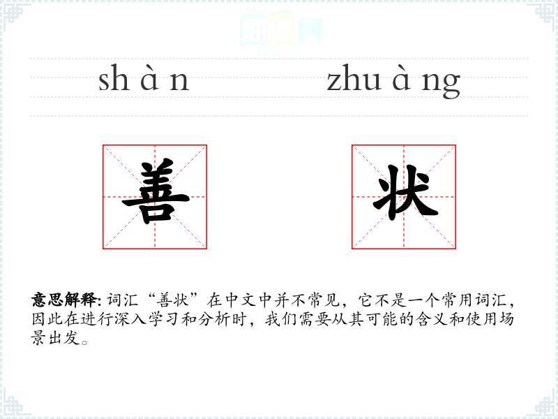 词汇“善状”在中文中并不常见,它不是一个常用词汇,因此在进行深入学习和分析时,我们需要从其可能的含义和使用场景出发。