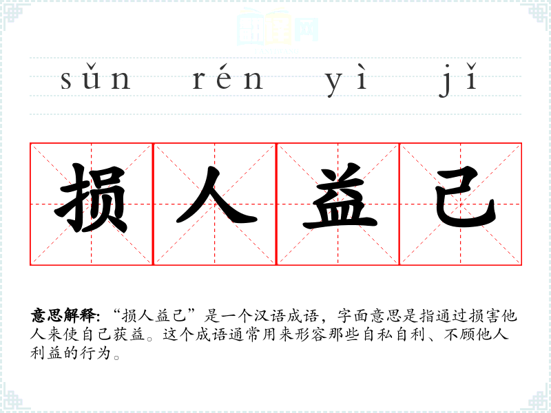 “损人益己”是一个汉语成语,字面意思是指通过损害他人来使自己获益。这个成语通常用来形容那些自私自利、不顾他人利益的行为。