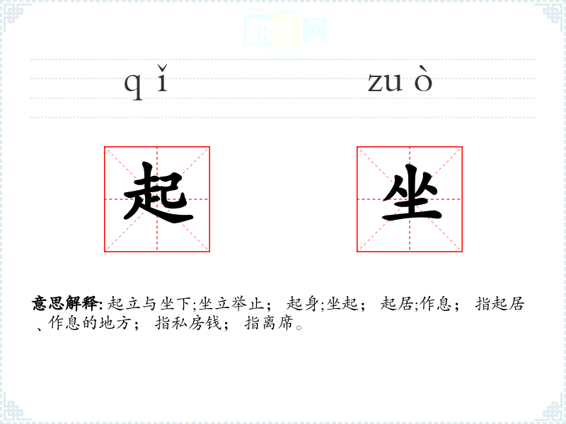 起立与坐下;坐立举止; 起身;坐起; 起居;作息; 指起居﹑作息的地方; 指私房钱; 指离席。