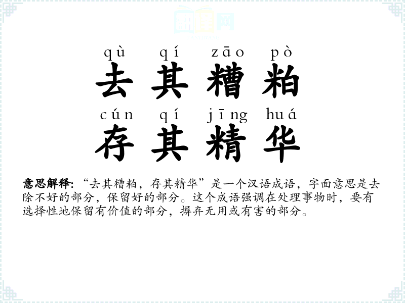 “去其糟粕,存其精华”是一个汉语成语,字面意思是去除不好的部分,保留好的部分。这个成语强调在处理事物时,要有选择性地保留有价值的部分,摒弃无用或有害的部分。