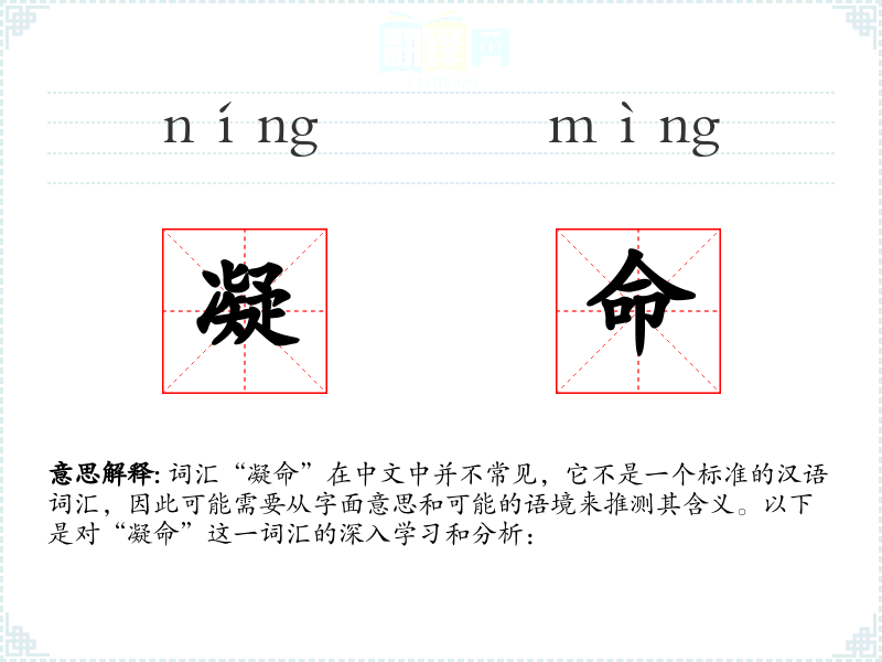 词汇“凝命”在中文中并不常见,它不是一个标准的汉语词汇,因此可能需要从字面意思和可能的语境来推测其含义。以下是对“凝命”这一词汇的深入学习和分析: