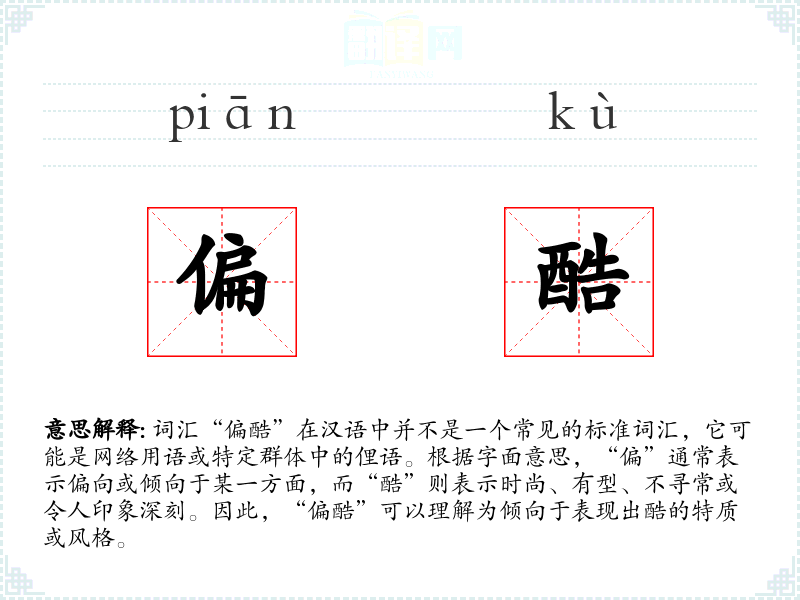 - 口语:在日常对话中,年轻人可能会用这个词来形容朋友的穿着或行为,如“你今天的打扮好偏酷啊!”