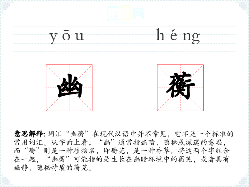 由于“幽蘅”不是一个常用词汇,其词源和演变不详。可能是某个特定文学作品或个人创作中临时组合的词汇。