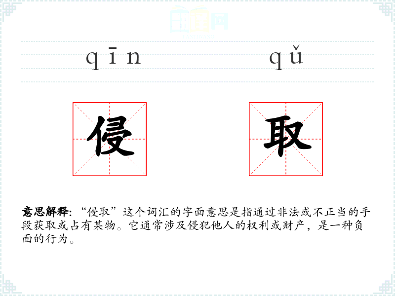 “侵取”这个词汇的字面意思是指通过非法或不正当的手段获取或占有某物。它通常涉及侵犯他人的权利或财产,是一种负面的行为。