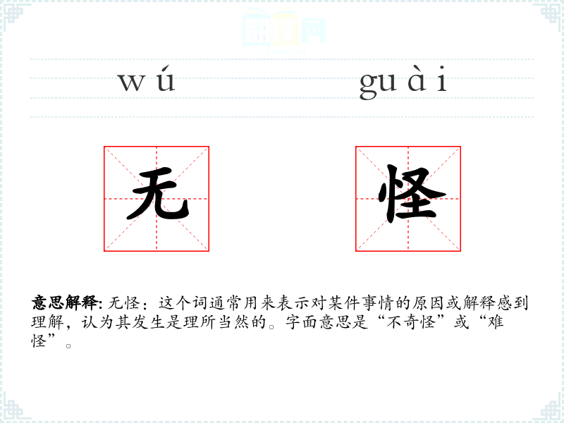 无怪:这个词通常用来表示对某件事情的原因或解释感到理解,认为其发生是理所当然的。字面意思是“不奇怪”或“难怪”。