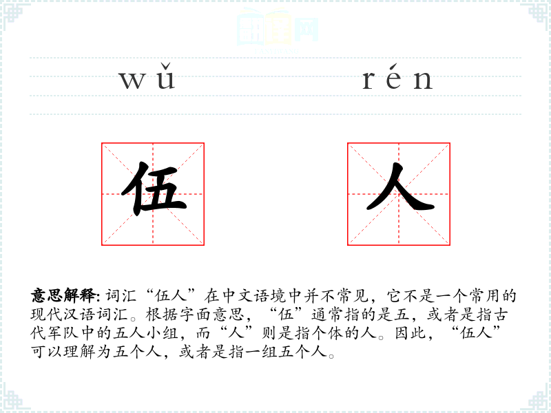- 词源:“伍”源自古代军队的编制,而“人”则是指个体。
