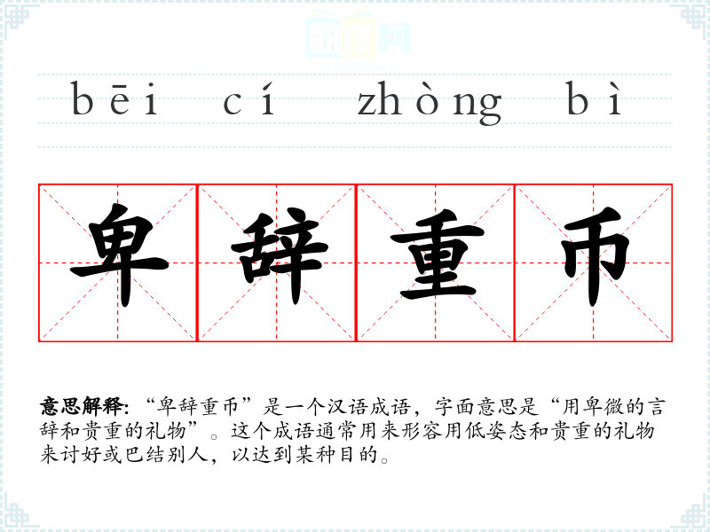 “卑辞重币”是一个汉语成语,字面意思是“用卑微的言辞和贵重的礼物”。这个成语通常用来形容用低姿态和贵重的礼物来讨好或巴结别人,以达到某种目的。