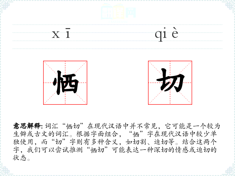 词汇“恓切”在现代汉语中并不常见,它可能是一个较为生僻或古文的词汇。根据字面组合,“恓”字在现代汉语中较少单独使用,而“切”字则有多种含义,如切割、迫切等。结合这两个字,我们可以尝试推测“恓切”可能表达一种深切的情感或迫切的状态。