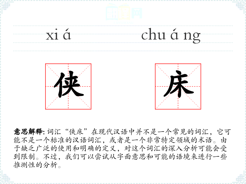 词汇“侠床”在现代汉语中并不是一个常见的词汇,它可能不是一个标准的汉语词汇,或者是一个非常特定领域的术语。由于缺乏广泛的使用和明确的定义,对这个词汇的深入分析可能会受到限制。不过,我们可以尝试从字面意思和可能的语境来进行一些推测性的分析。