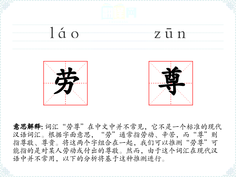 词汇“劳尊”在中文中并不常见,它不是一个标准的现代汉语词汇。根据字面意思,“劳”通常指劳动、辛苦,而“尊”则指尊敬、尊贵。将这两个字组合在一起,我们可以推测“劳尊”可能指的是对某人劳动或付出的尊敬。然而,由于这个词汇在现代汉语中并不常用,以下的分析将基于这种推测进行。