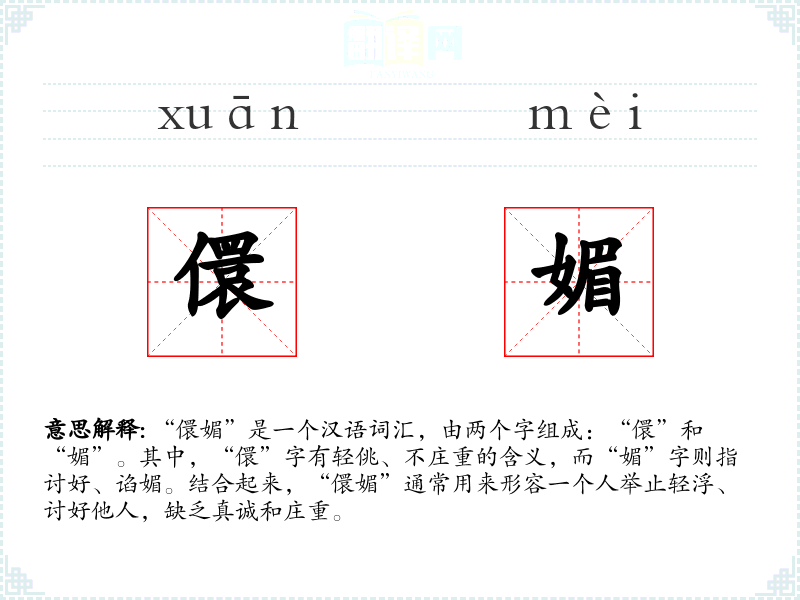 “儇媚”是一个汉语词汇,由两个字组成:“儇”和“媚”。其中,“儇”字有轻佻、不庄重的含义,而“媚”字则指讨好、谄媚。结合起来,“儇媚”通常用来形容一个人举止轻浮、讨好他人,缺乏真诚和庄重。