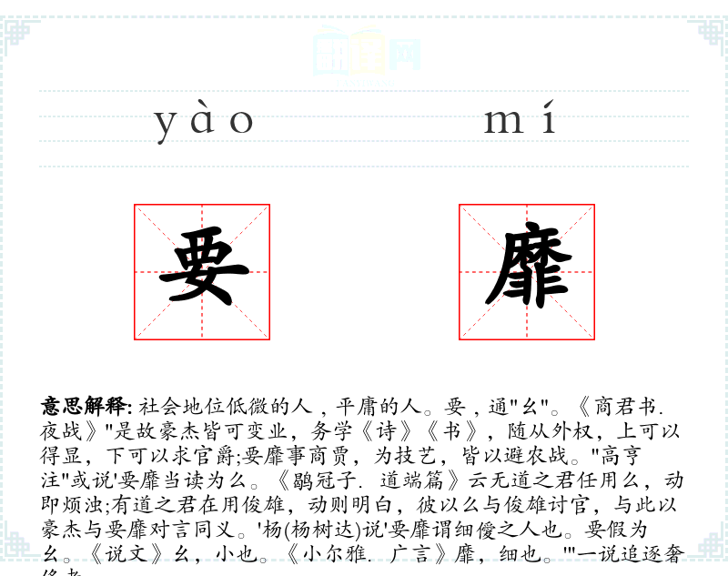 1.社会地位低微的人﹐平庸的人。要﹐通"幺"。《商君书.夜战》"是故豪杰皆可变业,务学《诗》《书》,随从外权,上可以得显,下可以求官爵;要靡事商贾,为技艺,皆以避农战。"高亨注"或说'要靡当读为么。《鹖冠子.道端篇》云无道之君任用么,动即烦浊;有道之君在用俊雄,动则明白,彼以么与俊雄讨官,与此以豪杰与要靡对言同义。'杨(杨树达)说'要靡谓细僾之人也。要假为幺。《说文》幺,小也。《小尔雅.广言》靡,细也。'"一说追逐奢侈者。