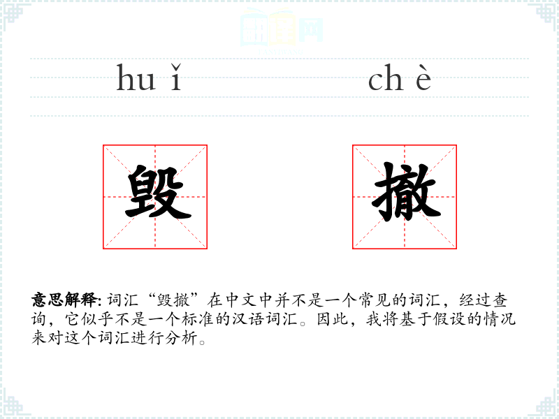 词汇“毁撤”在中文中并不是一个常见的词汇,经过查询,它似乎不是一个标准的汉语词汇。因此,我将基于假设的情况来对这个词汇进行分析。