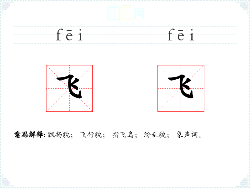 飘扬貌; 飞行貌; 指飞鸟; 纷乱貌; 象声词。
