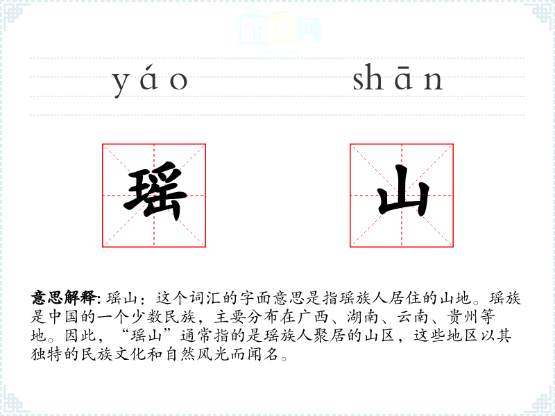 在文学作品中,“瑶山”常常被用来描绘瑶族人的生活环境和文化特色,如山歌、舞蹈、服饰等。在口语中,提到“瑶山”可能会让人联想到瑶族的独特风情和自然美景。在专业领域,如民族学、地理学等,“瑶山”可能被用来指代特定的地理区域或研究对象。