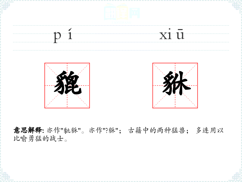 亦作"豼貅"。亦作"?貅"; 古籍中的两种猛兽; 多连用以比喻勇猛的战士。