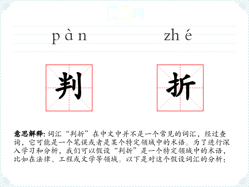 词汇“判折”在中文中并不是一个常见的词汇,经过查询,它可能是一个笔误或者是某个特定领域中的术语。为了进行深入学习和分析,我们可以假设“判折”是一个特定领域中的术语,比如在法律、工程或文学等领域。以下是对这个假设词汇的分析: