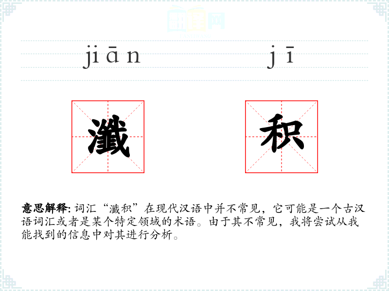 词汇“瀸积”在现代汉语中并不常见,它可能是一个古汉语词汇或者是某个特定领域的术语。由于其不常见,我将尝试从我能找到的信息中对其进行分析。