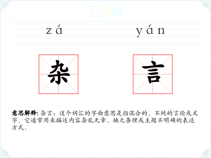 杂言:这个词汇的字面意思是指混合的、不纯的言论或文字。它通常用来描述内容杂乱无章、缺乏条理或主题不明确的表达方式。