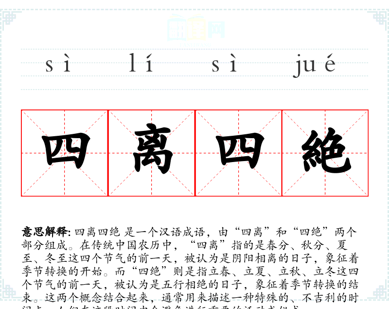 四离四绝 是一个汉语成语,由“四离”和“四绝”两个部分组成。在传统**农历中,“四离”指的是春分、秋分、夏至、冬至这四个节气的前一天,被认为是阴阳相离的日子,象征着季节转换的开始。而“四绝”则是指立春、立夏、立秋、立冬这四个节气的前一天,被认为是五行相绝的日子,象征着季节转换的结束。这两个概念结合起来,通常用来描述一种特殊的、不吉利的时间点,人们在这段时间内会避免进行重要的活动或仪式。