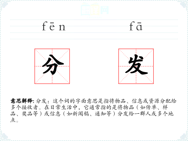 分发:这个词的字面意思是指将物品、信息或资源分配给多个接收者。在日常生活中,它通常指的是将物品(如传单、样品、奖品等)或信息(如新闻稿、通知等)分发给一群人或多个地点。