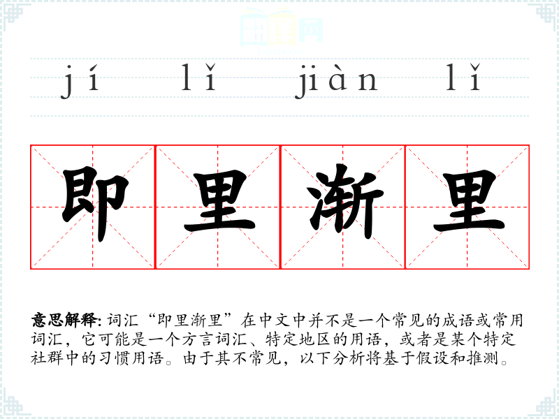 由于“即里渐里”不是一个标准汉语词汇,我们无法给出确切的基本定义。它可能是由“即”、“里”、“渐”、“里”四个字组合而成的,每个字都有自己的含义,但组合起来可能表达一种逐渐深入或逐渐变化的意思。