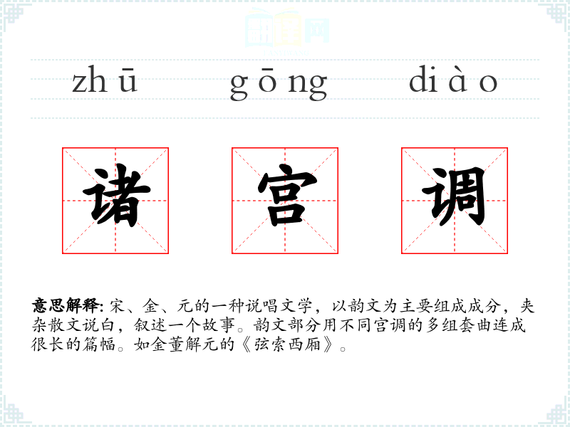 宋、金、元的一种说唱文学,以韵文为主要组成成分,夹杂散文说白,叙述一个故事。韵文部分用不同宫调的多组套曲连成很长的篇幅。如金董解元的《弦索西厢》。