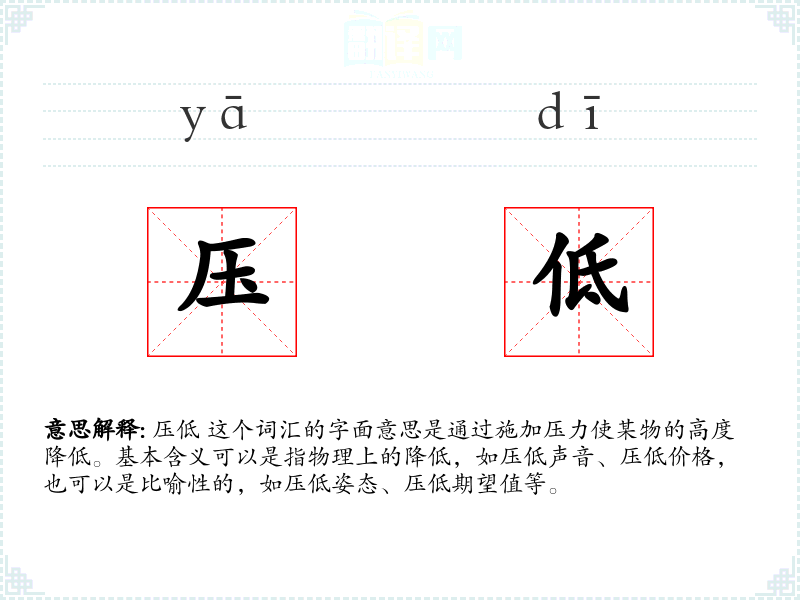 “压低”这个词汇的词源较为直接,由“压”和“低”两个字组成,表示通过压力使某物降低。在汉语中,这种组合方式常见于描述物理或抽象的降低动作。