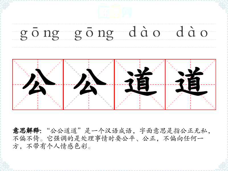 “公公道道”是一个汉语成语,字面意思是指公正无私,不偏不倚。它强调的是处理事情时要公平、公正,不偏向任何一方,不带有个人情感色彩。