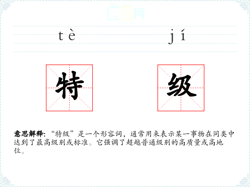 “特级”一词源自汉语,由“特”和“级”两个字组成。在古代汉语中,“特”有独特、特别的含义,“级”则表示等级或级别。随着时间的推移,“特级”逐渐被用来表示最高级别的含义。