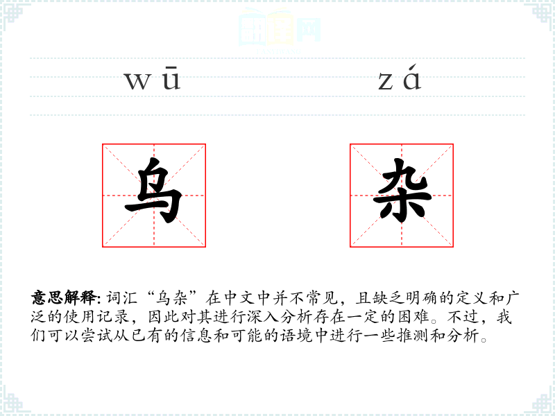 “乌杂”这个词的字面意思可能与“混乱”、“杂乱无章”或“不纯净”有关。由于缺乏确切的定义,这里的解释更多是基于字面组合的推测。