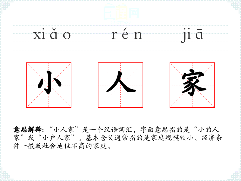 在文学作品中,“小人家”常用来描绘朴素、温馨的家庭生活,或是表达对平凡生活的赞美。在口语中,这个词可能带有一定的贬义,暗示家庭条件不佳或社会地位低下。在专业领域,如社会学或经济学中,可能会用这个词来描述特定社会阶层或经济状况的家庭。