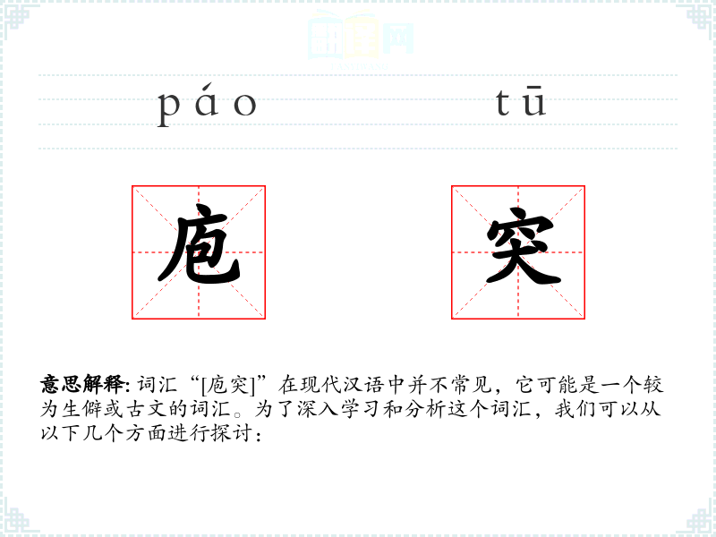 词汇“[庖突]”在现代汉语中并不常见,它可能是一个较为生僻或古文的词汇。为了深入学习和分析这个词汇,我们可以从以下几个方面进行探讨: