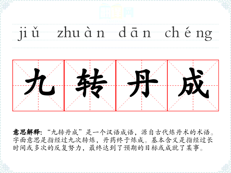 “九转丹成”是一个汉语成语,源自古代炼丹术的术语。字面意思是指经过九次转炼,丹药终于炼成。基本含义是指经过长时间或多次的反复努力,最终达到了预期的目标或成就了某事。