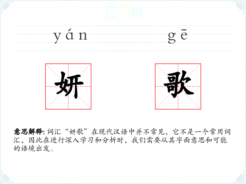 词汇“妍歌”在现代汉语中并不常见,它不是一个常用词汇,因此在进行深入学习和分析时,我们需要从其字面意思和可能的语境出发。