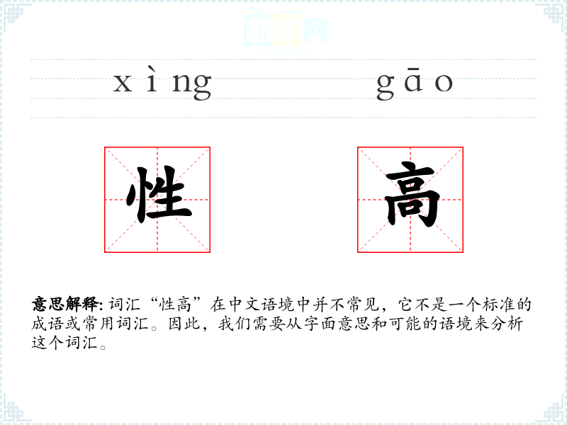 词汇“性高”在中文语境中并不常见,它不是一个标准的成语或常用词汇。因此,我们需要从字面意思和可能的语境来分析这个词汇。
