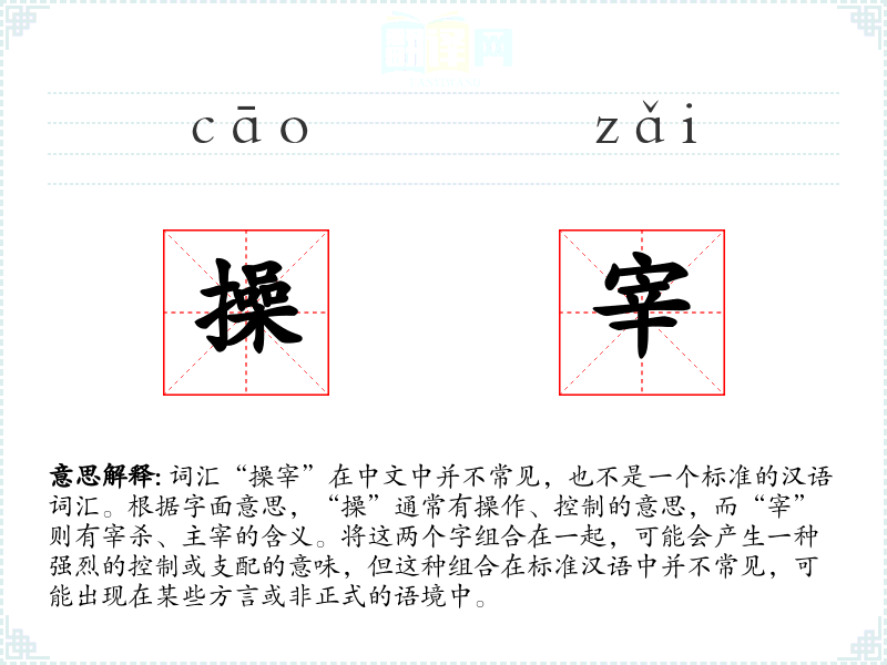 由于“操宰”不是一个标准词汇,它在文学、口语或专业领域中的使用非常有限。可能在一些特定的方言或非正式的语境中出现,表达对某事物的绝对控制或支配。