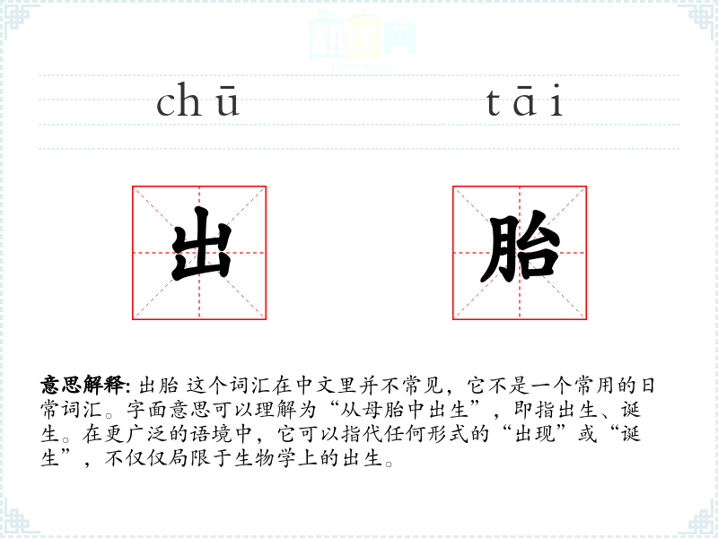 出胎 这个词汇的词源较为直接,由“出”和“胎”两个字组成。在古代汉语中,“胎”通常指生物体内的胚胎,而“出”则表示从内部到外部的动作。随着时间的推移,这个词汇的含义逐渐扩展,不仅仅局限于生物学上的出生。