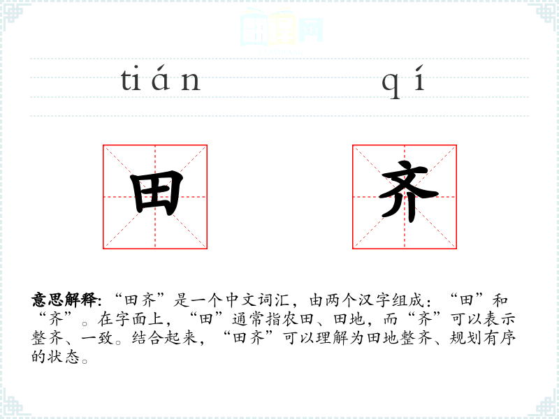 “田齐”是一个中文词汇,由两个汉字组成:“田”和“齐”。在字面上,“田”通常指农田、田地,而“齐”可以表示整齐、一致。结合起来,“田齐”可以理解为田地整齐、规划有序的状态。