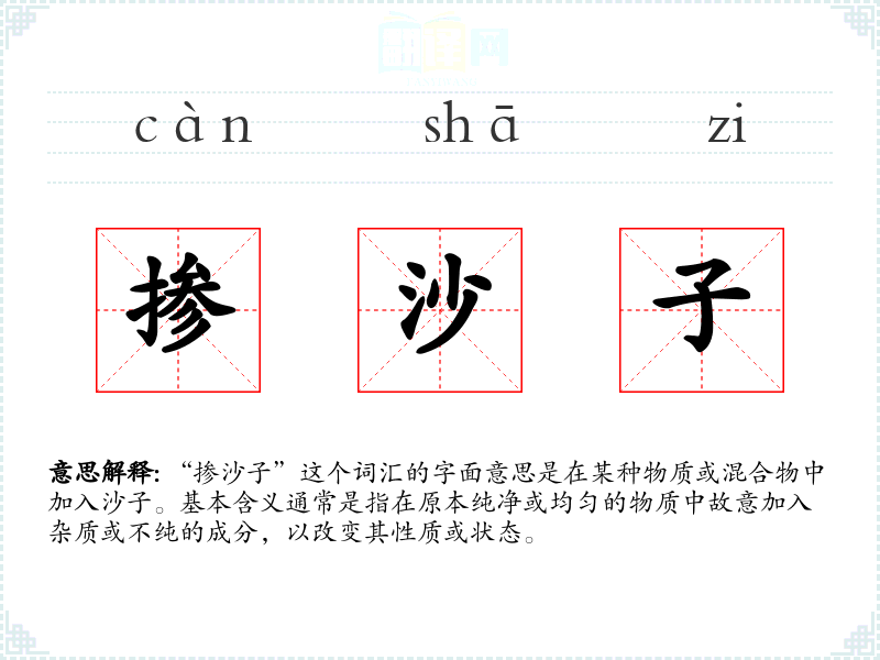“掺沙子”这个词汇的字面意思是在某种物质或混合物中加入沙子。基本含义通常是指在原本纯净或均匀的物质中故意加入杂质或不纯的成分,以改变其性质或状态。