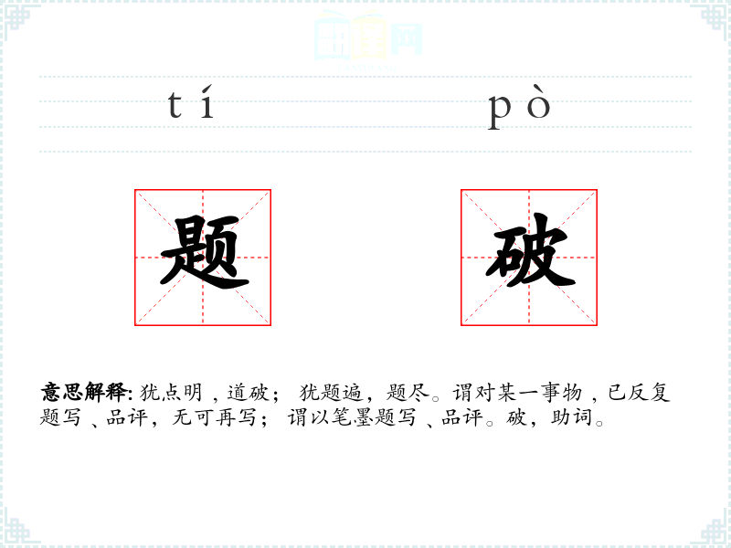 犹点明﹐道破; 犹题遍,题尽。谓对某一事物﹐已反复题写﹑品评,无可再写; 谓以笔墨题写﹑品评。破,助词。