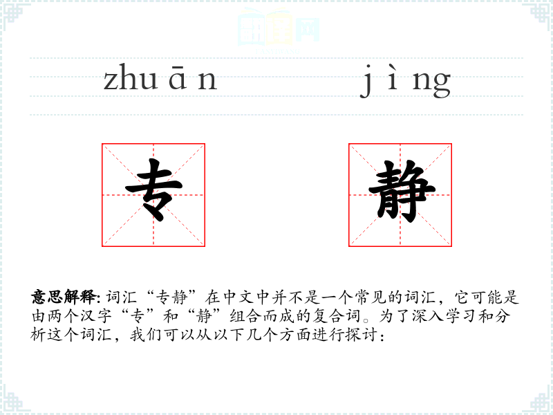词汇“专静”在中文中并不是一个常见的词汇,它可能是由两个汉字“专”和“静”组合而成的复合词。为了深入学*和分析这个词汇,我们可以从以下几个方面进行探讨: