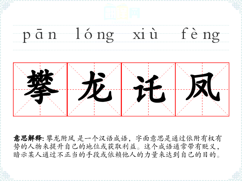 攀龙附凤 是一个汉语成语,字面意思是通过依附有权有势的人物来提升自己的地位或获取利益。这个成语通常带有贬义,暗示某人通过不正当的手段或依赖他人的力量来达到自己的目的。