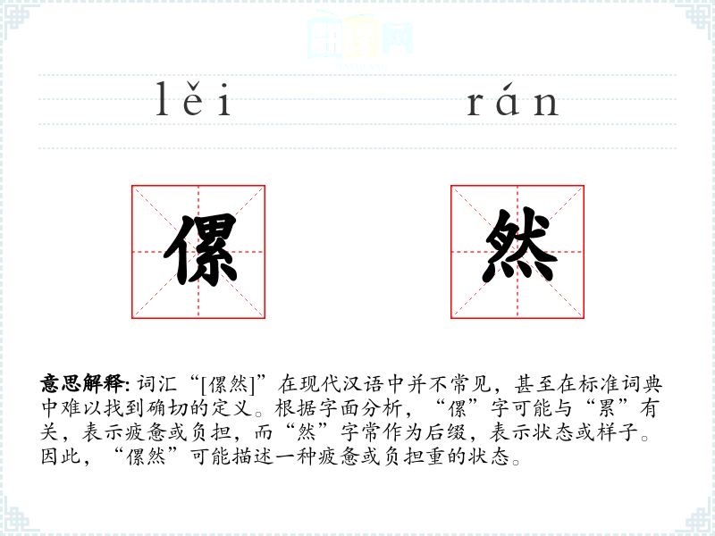 由于“傫然”不是一个常用词汇,其基本含义可能指的是一种疲惫不堪、精神或身体上极度劳累的状态。