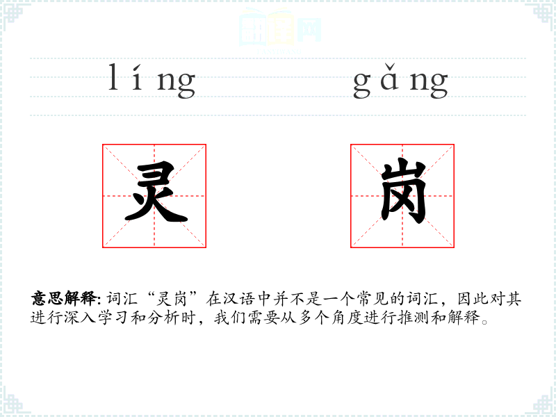 词汇“灵岗”在汉语中并不是一个常见的词汇,因此对其进行深入学*和分析时,我们需要从多个角度进行推测和解释。